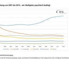 28.01.2014. Rund 75.000 Versicherte bezogen 2012 erstmals eine Rente wegen Erwerbsminderung aufgrund psychischer Erkrankungen. Sie sind durchschnittlich 49 Jahre alt. Fast jede zweite neue Frührente ist inzwischen psychisch verursacht (42 Prozent). Dabei haben seit 2001 vor allem Depressionen (plus 96 Prozent), Persönlichkeits- und Verhaltensstörungen (plus 74 Prozent) sowie Suchterkrankungen (plus 49 Prozent) als Grund zugenommen. Psychische Erkrankungen sind seit mehr als zehn Jahren die Hauptursache für gesundheitsbedingte Frührenten mit großem Abstand vor körperlichen Erkrankungen. Eine Erwerbsminderungsrente beträgt durchschnittlich rund 600 Euro. "Psychisch bedingte Frührenten könnten häufiger vermieden werden. Es mangelt an Behandlungsplätzen für psychisch kranke Menschen, aber auch an ausreichenden und für sie maßgeschneiderten Rehabilitationsleistungen", kritisiert Prof. Dr. Rainer Richter, Präsident der Bundespsychotherapeutenkammer (BPtK). "Psychische Erkrankungen führen viel zu oft zu Erwerbsunfähigkeit und Armut."