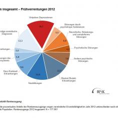 Wegen psychischer Erkrankungen müssen Arbeitnehmer weit vor dem gesetzlichen Rentenalter aus dem Erwerbsleben ausscheiden. Ein Versicherter, der aufgrund einer psychischen Erkrankung in Rente gehen muss, ist durchschnittlich erst 49 Jahre alt. "Dass psychische Erkrankungen so häufig und so früh zu Renten wegen verminderter Erwerbsfähigkeit führen, liegt auch daran, dass psychisch kranke Menschen nicht oder nicht rechtzeitig behandelt werden", stellt BPtK-Präsident Richter fest. Psychisch kranke Menschen warten in Deutschland rund drei Monate auf einen ersten Termin in einer psychotherapeutischen Praxis. Viele geben bei der Suche nach einem Behandlungsplatz auf und bleiben unbehandelt. In Deutschland erhält überhaupt nur jeder dritte psychisch Kranke eine Behandlung. "Für diesen Missstand findet das deutsche Gesundheitssystem seit Jahren keine angemessene Lösung", kritisiert Richter. "Wir brauchen dringend einen Ausbau der psychotherapeutischen Versorgung." "Insbesondere Menschen mit psychischen Erkrankungen erhalten zu selten oder nicht auf ihre Bedürfnisse zugeschnittene Rehabilitationsleistungen, die ihnen die Rückkehr ins Arbeitsleben ermöglichen könnten", so der BPtK-Präsident. Jeder zweite psychisch kranke Frührentner erhielt in den fünf Jahren vor dem Rentenbescheid keine Reha-Leistung. Und weniger als zehn Prozent der psychisch kranken Frührentner wurden eine medizinische oder berufliche Rehabilitation empfohlen. Die Zahl der Reha-Maßnahmen ist nicht im gleichen Maß gestiegen wie die Zahl der Erwerbsminderungsrenten wegen psychischer Erkrankungen. Im Jahr 2011 waren psychische Erkrankungen für rund 40 Prozent der neuen Frührenten verantwortlich. Aber nur 20 Prozent der Reha-Leistungen wurden für Menschen mit psychischen Erkrankungen eingesetzt.