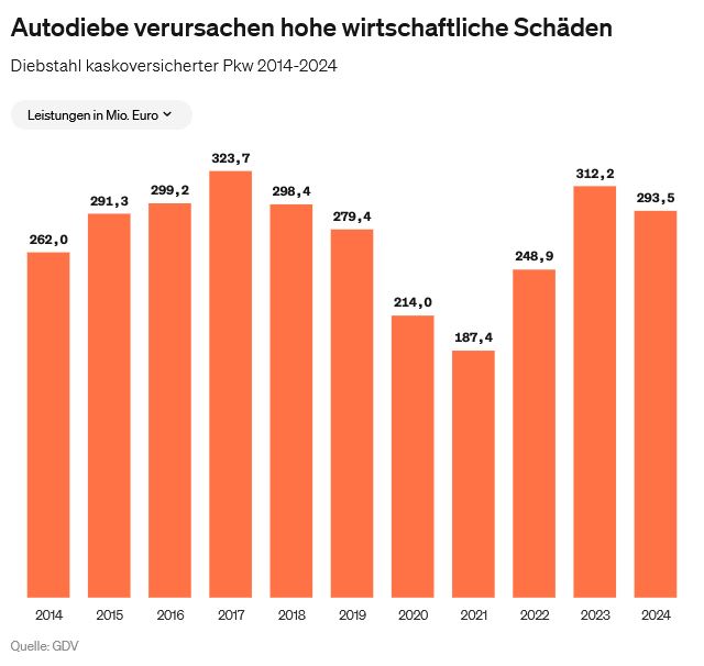 Autodiebe haben im vergangenen Jahr 14.162 kaskoversicherte Pkw gestohlen und damit erneut hohe wirtschaftliche Schäden verursacht. „2024 haben die Kfz-Versicherer ihre Kunden mit rund 293 Millionen Euro entschädigt“, sagt Jörg Asmussen, Hauptgeschäftsführer des Gesamtverbandes der Deutschen Versicherungswirtschaft (GDV). Im Vergleich zum Vorjahr sanken sowohl die Zahl der Diebstähle (2023: 14.585) als auch die Schadensumme (2023: 312 Millionen Euro) leicht. Doch nach den Niedrigständen während der Corona-Pandemie bleibt das Niveau hoch. Bereits das zweite Jahr in Folge wurden wieder mehr als 14.000 Fahrzeuge gestohlen. „Durchschnittlich haben die Kfz-Versicherer jeden Tag fast 40 Diebstähle reguliert und dafür täglich mehr als 800.000 Euro gezahlt“, so Asmussen.