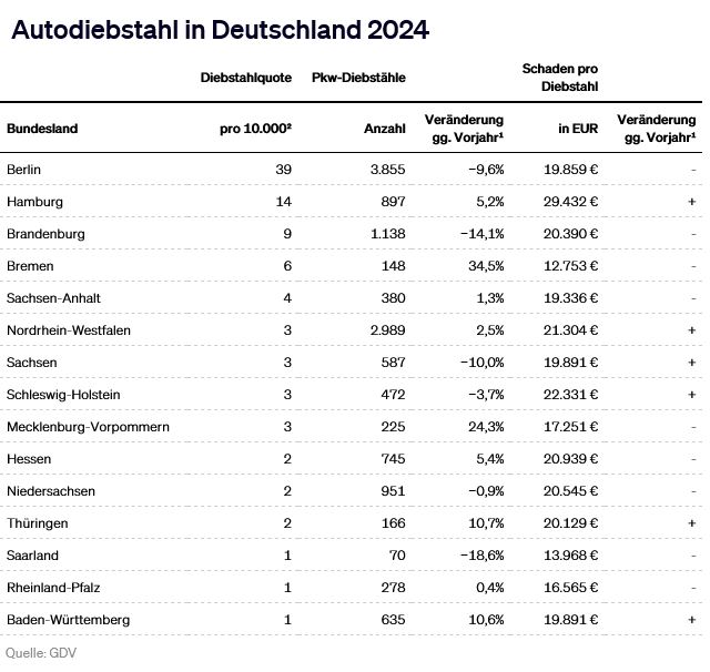 23.09.2025. Nach einem Rückgang während der Coronapandemie schlagen Autodiebe wieder häufiger zu. Die GDV-Statistik zeigt: Hotspot des Autodiebstahls bleibt die Hauptstadt.