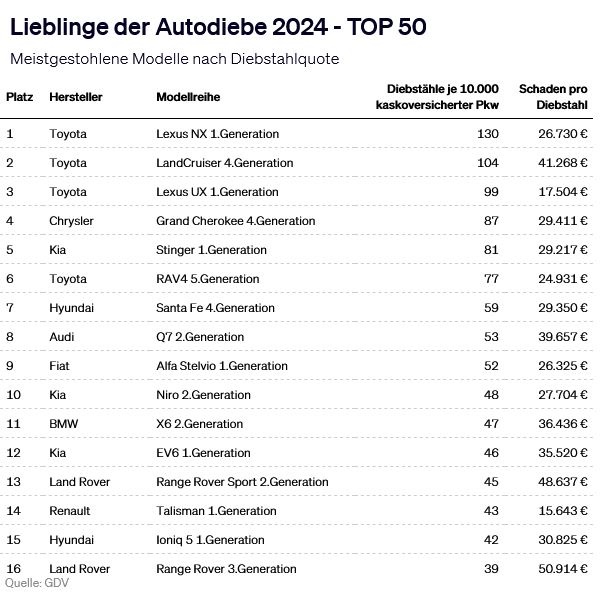 Derzeit stehen insbesondere Modelle von Toyota hoch im Kurs. Auf der Liste der zehn am häufigsten gestohlenen Modellreihen ist der japanische Hersteller mit vier Modellen vertreten. Wie bereits 2023 bilden gleich drei Toyota-Modelle die Spitze: Toyota Land Cruiser und Varianten des Lexus NX und Lexus UX. Besonders teuer waren Diebstähle von Porsche 911-Modellen, die im Durchschnitt jeweils mehr als 100.000 Euro kosteten.