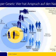 Die gesetzliche Erbfolge (siehe Grafik) tritt in Kraft, wenn kein Testament oder Erbvertrag vorliegt oder diese ungültig sind. Um die Erbfolge zu regeln, werden die Verwandten in "Ordnungen" eingeteilt. Zur ersten Ordnung gehören der Ehepartner, die eigenen Kinder, Enkel und Urenkel. Sie stehen in der Erbfolge an erster Stelle. Wenn ein Kind des Erblassers bereits verstorben ist, treten seine Söhne und Töchter an seine Stelle in der Erbfolge. Gleiches gilt für Enkel und Urenkel des Erblassers. Zur zweiten Ordnung zählen die Eltern des Erblassers, seine Geschwister sowie Nichten und Neffen. Zur dritten Ordnung zählen seine Großeltern, Tanten, Onkel, Cousins und Cousinen. Gibt es einen Erben in einer näheren Ordnung, gehen alle übrigen, entfernteren Ordnungen leer aus. Wurden nahe Verwandte durch Testament oder Erbvertrag von der Erbschaft ausgeschlossen, steht ihnen ein Pflichtteil zu. Dieser beträgt die Hälfte der Summe, die sie erhalten hätten, wenn der Verstorbene sie nicht enterbt hätte. Die Höhe des Erbteils hängt vom Verwandtschaftsverhältnis und der Zahl der Pflichtteilsberechtigten ab.