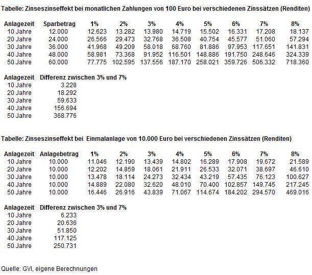 Tabelle "Zinszinseffekt bei Sparen und Einmalanlage"