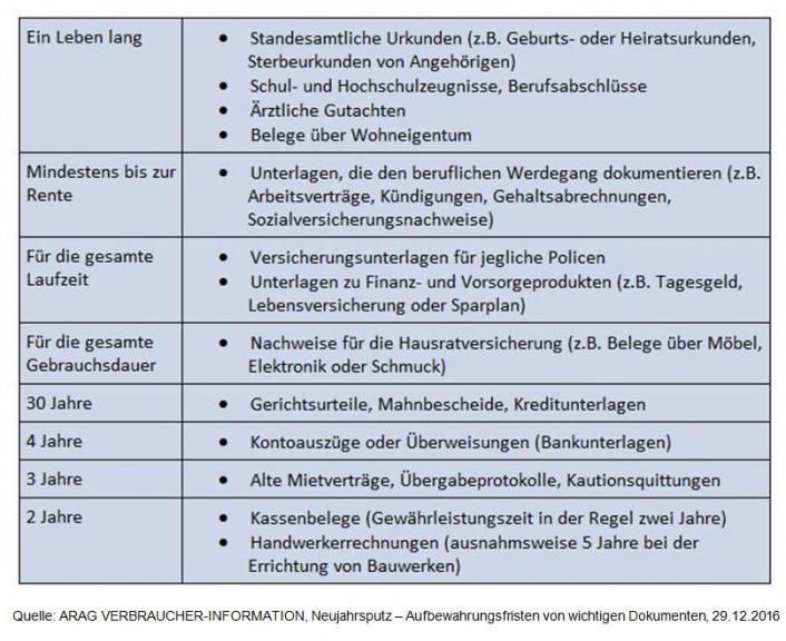 13.01.2017. Gute Vorsätze zum neuen Jahr haben oft eine überschaubare Halbwertzeit. Doch endlich Ordnung in die eigenen Dokumente zu bringen ist ein Vorhaben, das sich lohnt: Der Berg von Papieren in der Schreibtischschublade oder im Schuhkarton ganz hinten im Regal sollte tatsächlich ab und zu gesichtet werden. Oft stellt sich dann die Frage, „Kann das weg oder muss ich das aufbewahren?" ARAG-Experten kennen die Antworten bei den Aufbewahrungsfristen.
